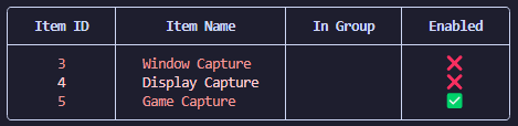 gobs-cli --style="red" --no-border sceneitem list