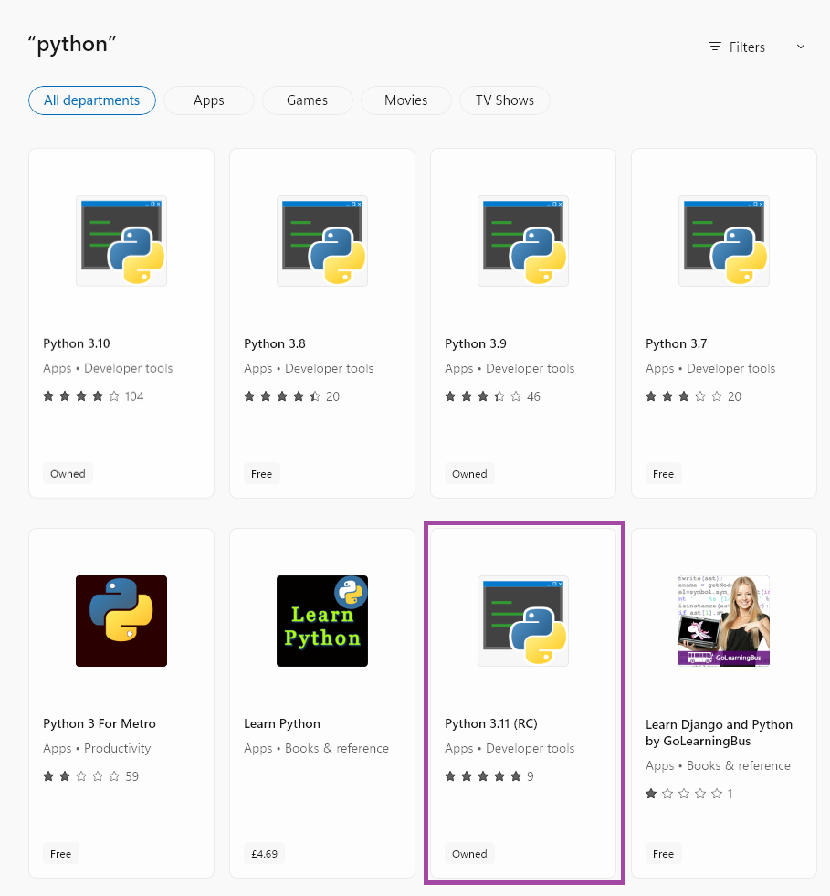 If you don't have Python already you can fetch it easily from the Windows Store. Simply type store into the windows search bar. To run this GUI you'll need the latest version, Python 3.11 (RC).